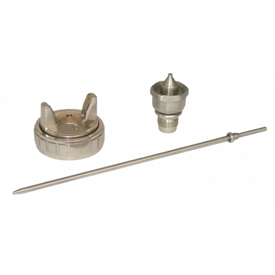Pour pistolets de peinture SWAvec : 1 buse 1,5 mm en inox – 1 aiguille en acier – 1 chapeau de buse en laiton nickelé avec bague de serrage intégrée