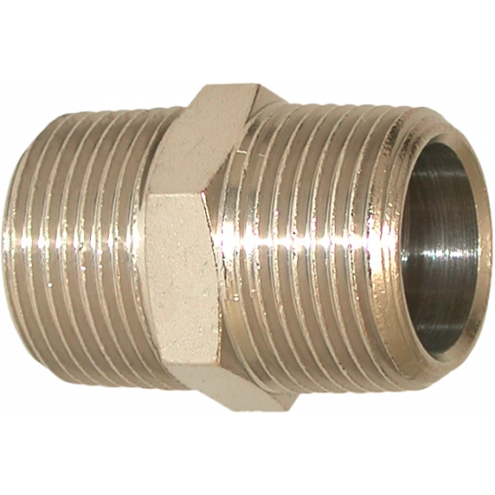 Raccord de jonction – double mâle – Raccord en laiton nickelĂ© – Filetages coniques : 3/4” Mâle – 3/4″ Mâle – Hexagone 27 mm